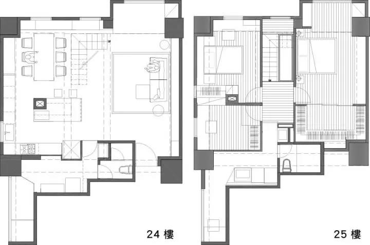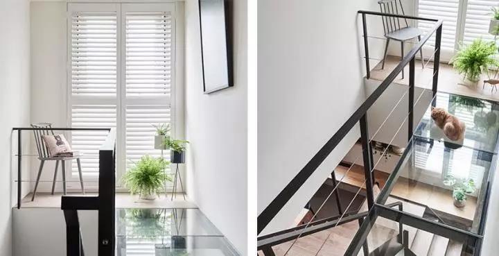 串联跃层的楼梯,设计师拆除原本厚重原木结构,透过黑铁设计搭配木头踩踏板,呈现轻盈且可穿透的视觉维度。另外考虑到光线问题,在卧室前方的走道,采用 1 + 1 的双层胶合玻璃创造空桥,增加光线相互流通,并且加装软垫片,就算因为地震爆裂碎片也不会散落满地。