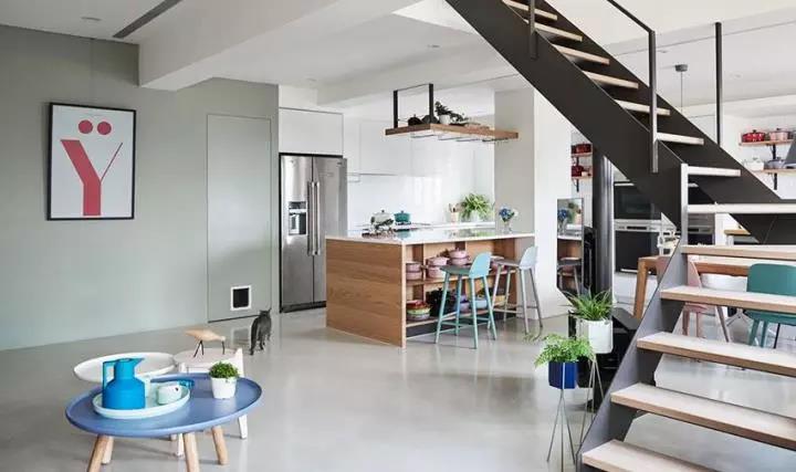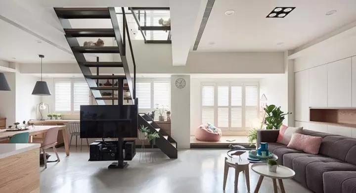 当空间被打开,电视墙也不一定要存在,挥别传统隔间规划,将电视利用可旋转铁柱,安装在楼梯位置,无论在家中何处都能一同观赏,另外沙发选择舒适实用的订制款式,藉由灰紫色系达到稳定视觉的效果,不靠墙的规划让后方墙面能成为大面积收纳柜,让生活物品有更多地方得以摆放。