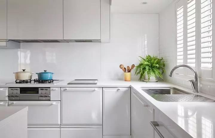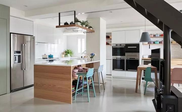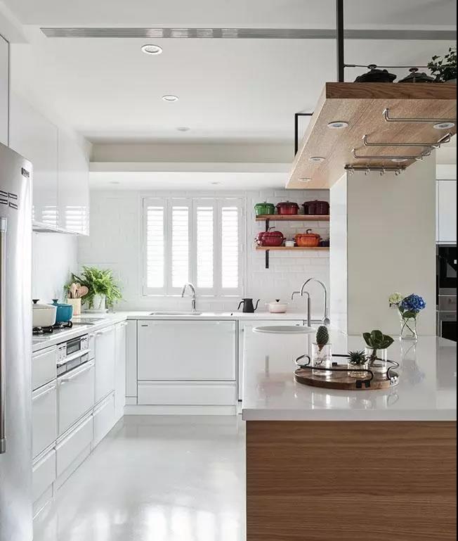 为了让自然光景以柔和方式呈现,空间本身藉由白色为主轴,仅在入口玄关运用草地绿油漆点缀森林感氛围,使整体空间感受加倍舒适明亮。再者因为女主人本身喜欢购买各色系缤纷铸铁锅,已为空间带来热闹生活感,藉由白色立面与灰色优的钢石地面简约质感衬托下,回归到舒适却不失单调的气息。