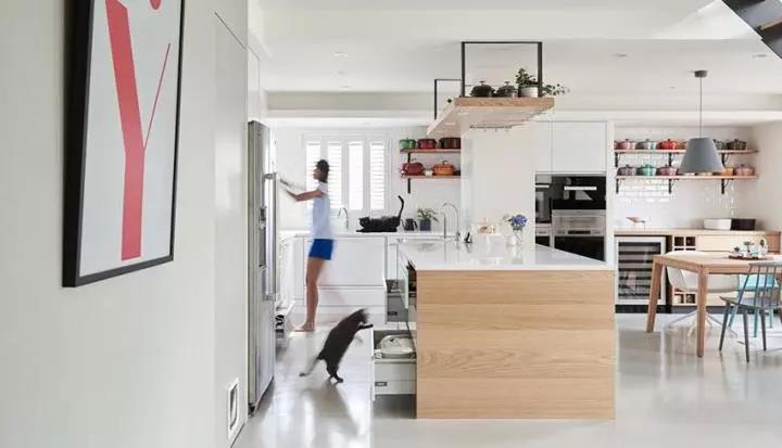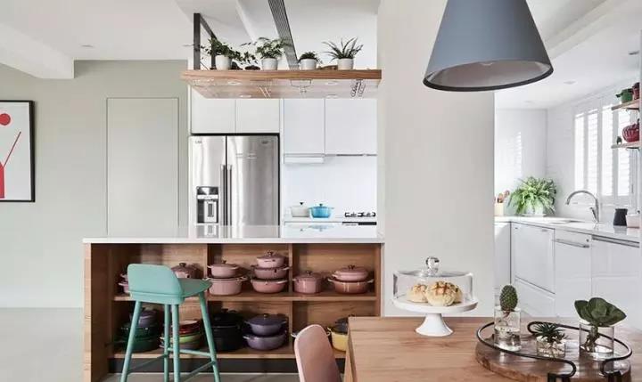 女主人相当爱下厨,因此拥有大量 LE CREUSET 铸铁锅,加上平日料理干货与猫咪食粮,除了利用厨房区域和中岛位置增加抽屉收纳外,额外在厨房后方增设独立储藏室,里头不但可以完整收放干货、日用品和大型家电,甚至规划猫咪跳台区,让猫咪不想见客时,还有自己的私密空间。