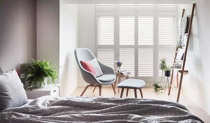 简单为主的主卧室,选择现成家具搭配布置,墙面涂刷灰色油漆,增加舒眠氛围。而专属卧室的窗边小区域,加上一张舒适单椅,成为最温暖的阅读角落。透过可折迭白色木百叶,随需求选折隐私遮蔽,方便夜晚看夜景也同时照样拥有白天的良好采光。