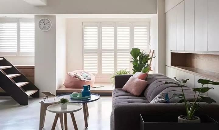 创造一个可以随时做日光浴的室内平台,靠近窗户先是以白色折迭式木百叶窗达到隐私与光线调整的功能,全开时可欣赏到 101 大楼景色,再加装木地板与摆放懒人沙发,让屋主一家人得以慵懒的躺在上头阅读或休憩,充分利用这块采光最好的区域。