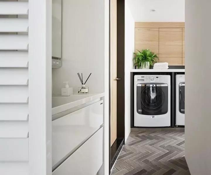 利用原本后阳台区域顺势规划成如同欧美国家的洗衣房,仍旧保有晒衣空间可自由运用,并规划手洗衣物的洗手台,以及摆放洗衣机和烘衣机,即便下雨天也不怕衣服不会干。地板则使用人字拼贴木纹砖,接续室内木地板的温润视觉。